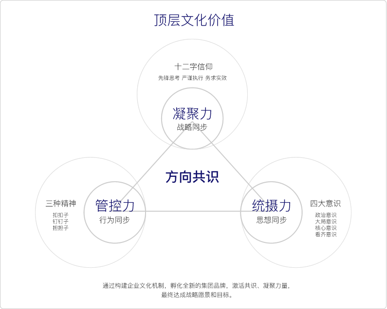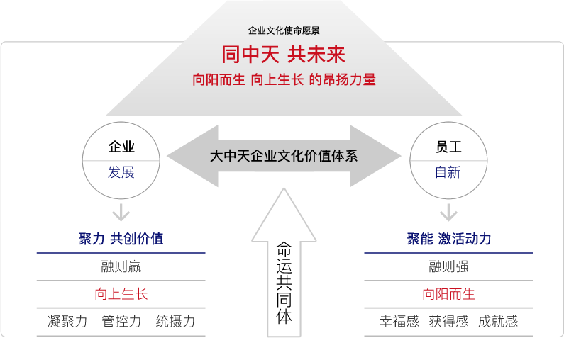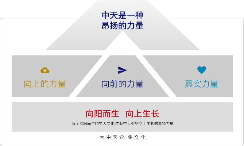 通过构建同中天、共未来的企业文化,孵化全新的集团品牌,激活共识、凝发力量,最终达成战略愿景和远景目标。每一位中天人,都将成为企业文化的践行者,企业发展的贡献者,企业秩序的维护者,企业进步的推动者,企业创新的引领者。